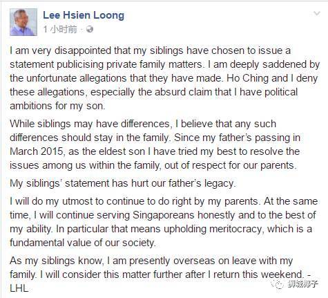 我很遗憾,我的手足选择以一份声明将家庭事务公之于众。对于他们所作的不成功的指控,我感到深深地悲痛。何晶与我否认这些指控,尤其是我对我儿子有政治野心的荒谬断言。