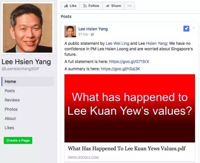 “李光耀的价值观被自己的儿子破坏了。我们的父亲置国家和人民于第一位,而不是个人声望或私人事项。对于被迫身置此境,我们十分悲伤。我们在自己的国家感到了巨大的不安及严密的监视。无论是作为兄长还是作为领导人,我们都无法再信任李显龙。我们已经对他失去信心。”