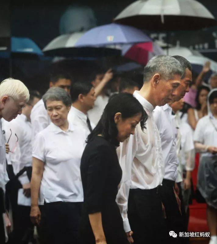 2015年3月29日,建国总理李光耀的国葬仪式于在新加坡国立大学文化中心举行。移灵队在中午12时30分从国会大厦出发,李显扬夫妇(右二及三)和李显龙总理、大嫂何晶(右一及四),以及家人伴着建国总理李光耀的灵柩离开国会大厦。(联合早报)