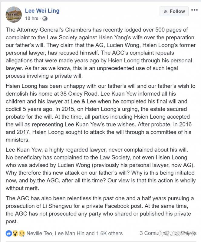 沉寂了八个月的李玮玲昨晚突然爆料称,总检察署因为建国总理李光耀遗嘱一事而向新加坡律师公会投诉李显扬妻子林学芬,并称“这个举动完全没有充分理据”。李玮玲还说,总检察署在投诉信中重申李总理“数年前通过个人代表律师提出的指控”,并称在私人遗嘱问题上启动这样的法律程序是“前所未有的”。