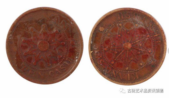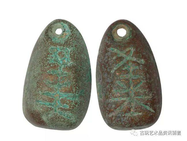 此鬼脸钱是中国春秋战国时期制造和使用的仿贝货币——铜贝的总称。重约重量两枚约56g,形似海贝,钱面铭文仿佛一张吓人的鬼脸,故俗称“鬼脸钱”。释文释“贝”、“哭”或“贝化”二字的古体合文,今人多倾向释“巽”。鬼脸钱在长江中下游各省均有大批出土,流通甚广,是战国中晚期楚地的主要流通货币之一。目前据统计存世量极为稀少,是一件不可多得的精品。