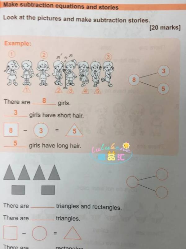 题目并不像中国式数学题目那样枯燥,相反地,图案多,花样多,正是新加坡数学的特点。