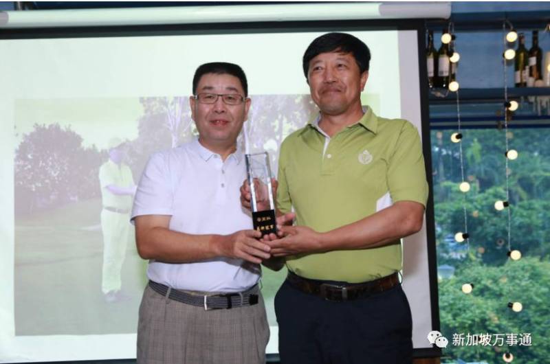 山西常青藤高尔夫球队队长杨俊峰(山西光明科技集团董事长)和新加坡晋商会名誉会长魏峰互赠礼物