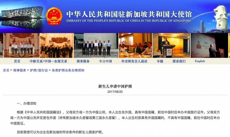 2.如果想持有中国国籍,必须在医院出生证明上注明小孩“不是新加坡人”,然后到中国大使馆办理护照。