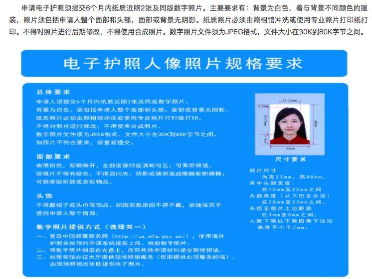 4.因电子护照对照片质量要求较高,预约时在线上传成功并不意味着一定合格,前台工作人员将要求照片不合格的申请人重新拍照。