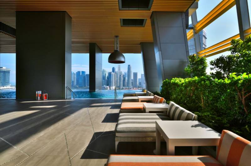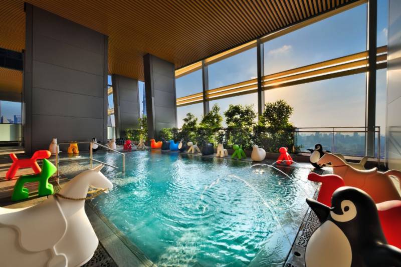 位于22楼的空中花园,不仅有健身区,还有可以边游泳边欣赏城市天际线的无边泳池。