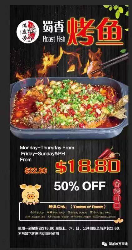 不知道该吃点什么的时候,总能想起鲜香味美的烤鱼,现在超好吃的满庭芳烤鱼又折扣哦!周一到周四烤鱼只要$18.8,周五六日和公共假期及前夕烤鱼$22.8。周末就走起吧!