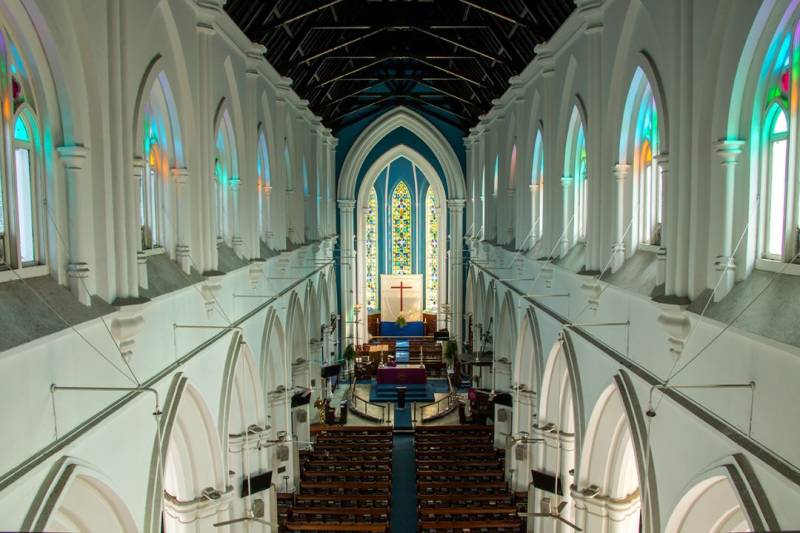 穿过拱形大门步入教堂,眼前是占据了半圆形后殿的三面炫目多彩的彩绘玻璃窗,每面彩窗纪念著新加坡历史上的重要人物,正中央的彩窗绘著的正是史丹福•莱佛士爵士(Sir Stamford Raffles)。