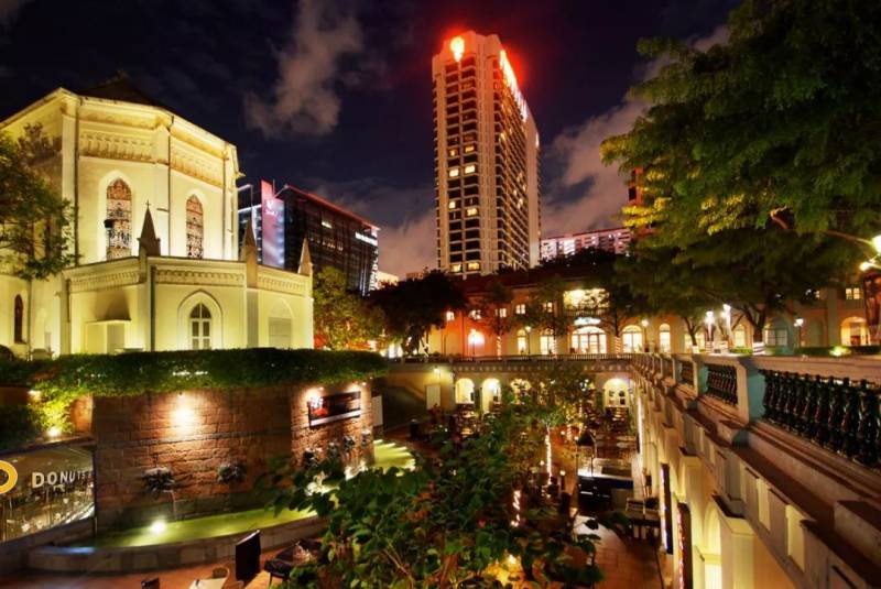 赞美坊教堂,又名赞美广场,原为圣婴耶稣修道院。广场毗邻莱佛士酒店,茵绿的草坪、净淙的大理石瀑布以及清新宽敞的庭院使其独具一股迷人的古典韵味。