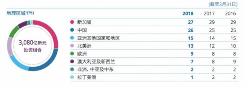 2017年,淡马锡在新加坡和中国的资产分别占投资组合的29%和25%;北美位居第四,占14%;其次是欧洲,占8%。金融服务业仍是淡马锡集中投资最大的行业领域,占总投资组合的26%;新加坡电信是淡马锡最大的单一投资,占投资组合的9%。
