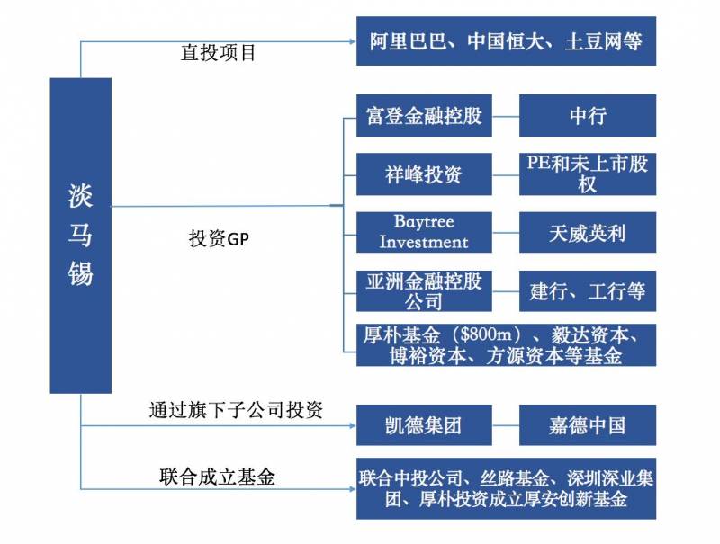 此外,淡马锡很多投资会通过旗下子公司或者与其他公司成立合资公司的方式进行。举例来说,著名的房地产商嘉德中国是淡马锡旗下凯德投资的子公司;入股中行和建行是通过富登金融控股和新加坡亚洲金融完成;投资地产通过丰树投资;投资PE和未上市股权通过祥峰投资;通过Baytree investment持有天威英利等等。2012年,淡马锡成立了一支管理规模25亿新加坡元(折合19亿美元)的基金由控股的兰亭投资国际有限公司投资,该基金由淡马锡控股原首席投资官Tow Heng Tan领导,专注投资北亚的基金及直接投资,尤其是投资中国私营企业及中小型企业的机会。