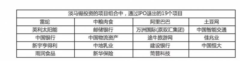 从2002年至今,淡马锡投资共完成在中国大陆及港澳台地区投资案例100多起,在目前淡马锡投资的项目组合中,独立IPO退出19个,并购退出1个,股权转让退出1个,项目IPO的比例高达20%。