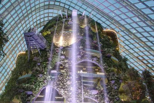 18颗擎天大树组成了独具一格的垂直花园,夜晚灯光亮起,仿佛进入阿凡达的奇幻世界。走进室室内的“云之森林”,7层楼高的瀑布飞流直下,真有种飞流直下三千尺的感觉。