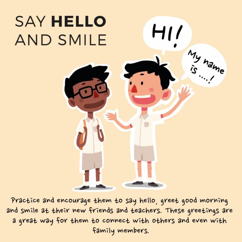 练习和鼓励他们向新朋友和新老师问好,问候早上好,微笑,这些问候是他们与他人,甚至与家人联系的好方法。