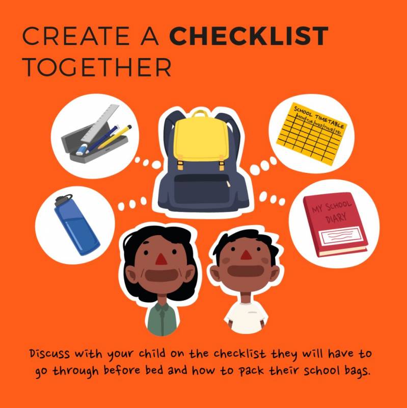 和你的孩子讨论一下他们睡觉前要检查的清单,以及如何打包他们的书包。