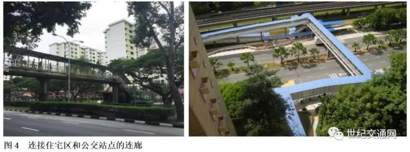 “畅行乘车计划”(Walk2Ride)是用带顶的连廊加强交通站点与周边住宅或其他建筑步行联系的建设,在现有交通站点400m 半径范围内(目前连廊覆蓋范围为200 m 半径范围)建设更多步行连廊;同时,所有公共汽车换乘点、地铁车站和较大流量公共汽车站点200m半径范围内的土地都将实现复合功能开发。至2018年9月,全岛这类步行连廊已从原先的46 km 增加至200 km,而且沿途设有指示牌、地铁路线图及歇息处,可让乘客在舒适的环境下步行到车站。这将大大改善乘客来往公交站点的体验,加强公交设施的可达性和吸引力(图4)。