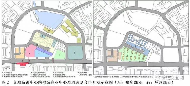 重要公共运输枢纽(integrated transporthubs,往往位于镇中心等重要位置)通过立体复合功能开发,形成不仅容纳地铁和公共汽车换乘站点,同时也是购物中心、公共图书馆、饮食中心等服务周边区域居民和通勤人士的综合体,而且在公共建筑的上面或相连位置设有高层办公或住宅建筑(图2,图3)。这类综合体占地并不很大,但位置重要,交通和公共服务效率很高,积极的辐射影响范围大,而且功能复合程度越来越高。目前全岛范围内已建成9 处这类依托交通枢纽的综合体,如金文泰中心(Clementi Mall)和勿洛中心(Bedok Mall)等,今后还将新增类似综合改造开发项目。