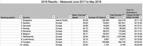 英国 Cable.co.uk 网站公布全球 200 个国家宽带网络下载速度排名榜,新加坡以平均下载速度为 60.39 Mbps 的网速夺得冠军,相当于下载一部 5GB 的高清电影仅需要 11 分钟,这网速太给力了!第二名和第三名分别是瑞典(46.00Mbps) 和丹麦(43.99Mbps)。