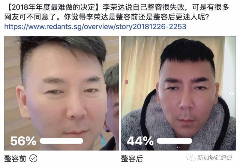 可是大多数网民表示不觉得失败,因为根本没什么区别。对此红蚂蚁也开了年度最艰难的投票,让大家票选李荣达究竟是整容前还是整容后好看。