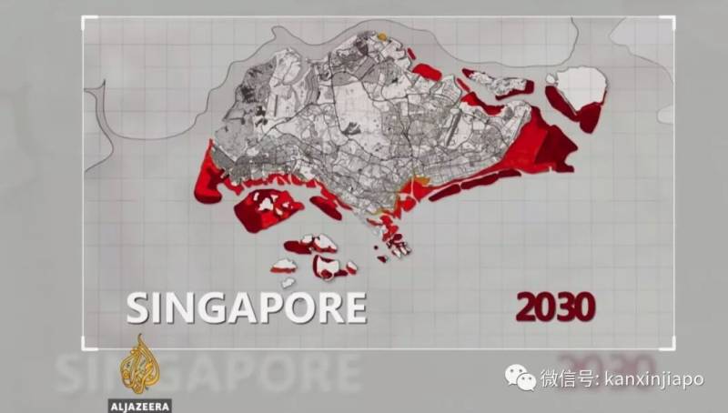 新加坡2030年填海造陆规划,深红色区域为未来规划地区,图源:Al-Jazeera