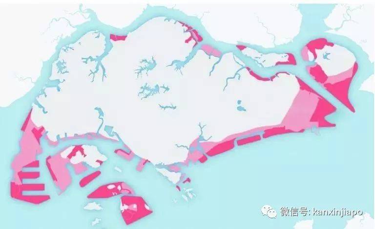 粉色部分是新加坡填海造陆的部分,包括现在的大士、裕廊岛、樟宜机场、滨海湾金融区、东海岸等地