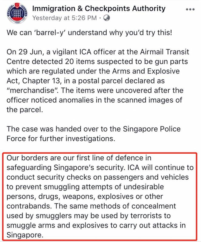 昨日(7月5日),新加坡移民与关卡局(ICA)发文告,在一个邮寄来新加坡的包裹里发现了20件看起来像枪支部件的物品。