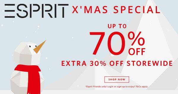 Esprit圣诞促销,全场低至7折!线上购物可享低至3折优惠!