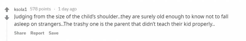不少人觉得孩子都这么大了,应该意识到不能睡在一个陌生人身上,孩子的父母没有尽到教育他的责任,所以黑衣阿姨的举动是可以被理解的。