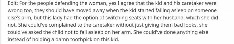 黑衣阿姨的老公于是建议和她换个座位。可阿姨气不过,不肯换座位,拿出牙签尖对着那个孩子。孩子要是打瞌睡的时再靠过来,就会被牙签刺到。