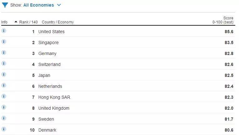 今年,世界经济论坛对评分进行了大幅调整,把未来技术驱动的经济成长作为导向,加入了多项新指标,从创新能力、开放性和灵活性等12项类别的98个要素进行综合考察。