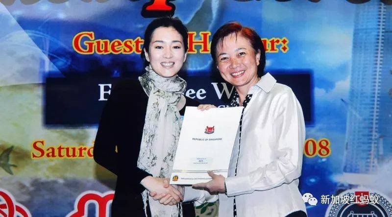 巩俐当年出席新加坡新公民宣誓仪式,从国会议员李美花手中接过公民权证书和粉红色身份证。(联合晚报)