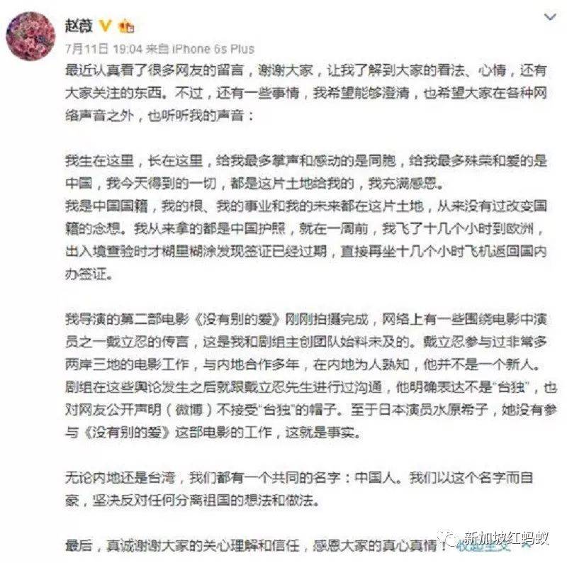 赵薇马上通过微博发文澄清,称自己从来拿的都是中国护照,拥有北京户口,根、事业和未来都在这片土地,从来没有过改变国籍的念想。