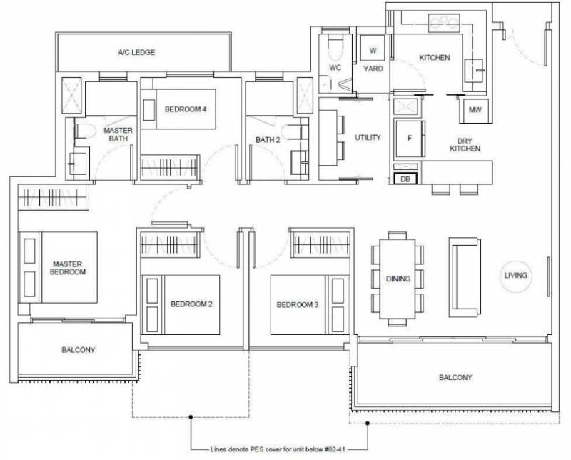 4房户型,有下图中两种不同户型,面积为116平方米/1249平方英尺,户型设计方正,适合大家庭住,游泳池朝向,价格为188.1万新币起