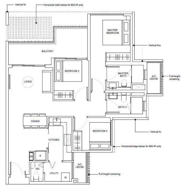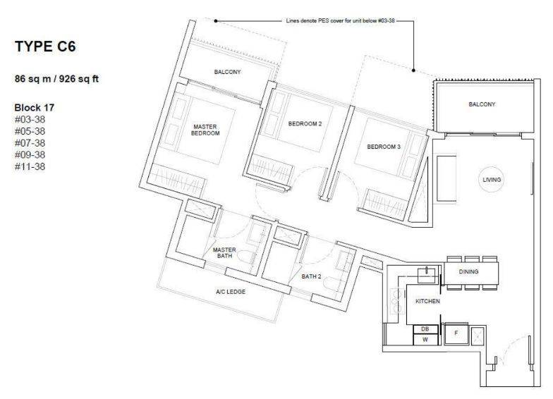 3房户型(优质)95平方米/1023平方英尺,带保姆房,封闭式厨房,适合家庭住,价格168.6万新币起