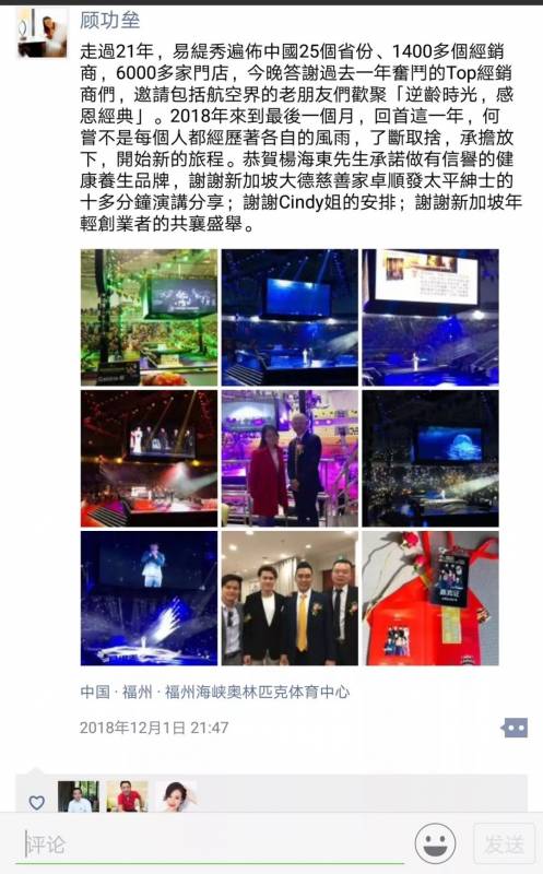 2018年12月1日,在福州海峡奥林匹克体育中心,新加坡品牌易缇秀为庆祝成立21周年盛典,投入巨资特别举办了“逆龄时光-感恩经典”万人明星演唱会,来自中国27个省市的易缇秀“家人们”欢聚一堂,同欢共庆!现场数万支荧光棒与舞台灯光及现场音效形成交相辉映,气氛一直都很嗨!
