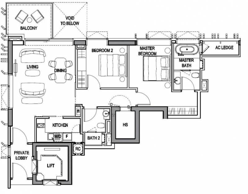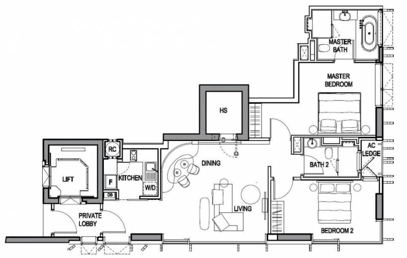 2卧室户型图,面积为99平方米,私人电梯直接入户,连主卧卫生间带浴缸 ,价格343.4万新币起