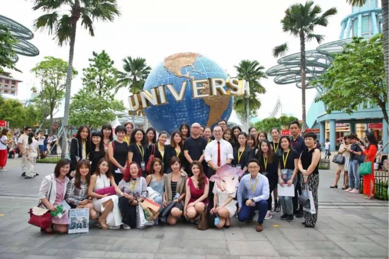 活动即将结束,孟老师和红领巾全体工作人员在游客必访的新加坡环球影城地球仪前合影。