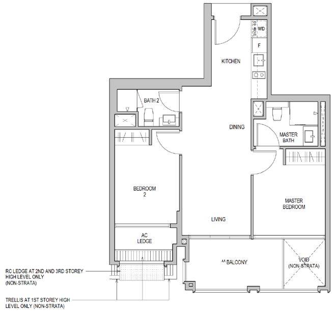 二卧室及二卧室+书房,合86套,套内面积65平方米(700平方尺)至90平方米(969平方尺),整套售价从S$1,395,000元起。特点也是户型方方正正,布局合理,采用开放式厨房,无浪费空间。两个房间均可放置双人床,客厅配备阳台。值得注意的是,有些户型采用封闭式阳台,增添了使用空间。书房位于入口处,可充分利用空间。这样的户型非常适合有一个孩子夫妇,以及专业人士和学生。除了自住,也适合出租给高端专业人士。