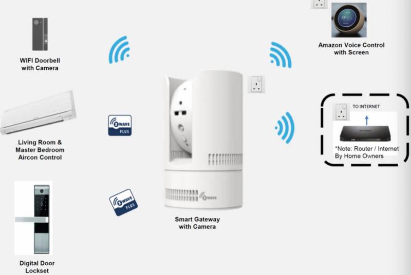 Smarthome Gateway系统:居民可以24小时监控自己的家园,图像和录像资料可上传至云储存或内置储存器储存。该系统可用来侦查住家内外的任何安全隐患,还配备夜视功能,以便能在夜间执行任务;还具有警铃功能,通过手机聆听家中发生的事情。