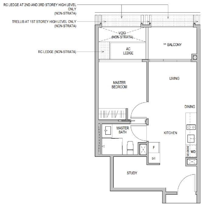 一卧室+书房,合64套,套内面积51平方米(549平方尺)至69平方米(743平方尺),整套售价从S$1,055,000元起。特点也是户型方方正正,布局合理,采用开放式厨房,无浪费空间。书房位于入口处,可充分利用空间,客厅配备阳台。这样的户型非常适合有一个孩子夫妇,以及专业人士和学生。除了自住,也适合出租给高端专业人士。