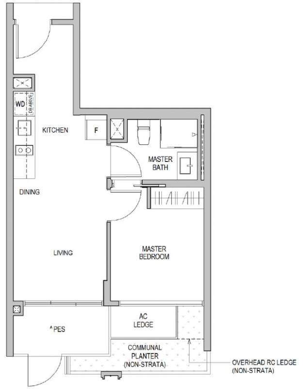 一卧室,合25套,套内面积46平方米(495平方尺)至60平方米(646平方尺),整套售价从S$938,000元起。特点是户型方方正正,布局合理,采用开放式厨房,无浪费空间,客厅相对独立,配备阳台。这样的户型非常适合夫妻情侣享受二人世界,以及专业人士和学生。除了自住,也适合出租给高端专业人士。