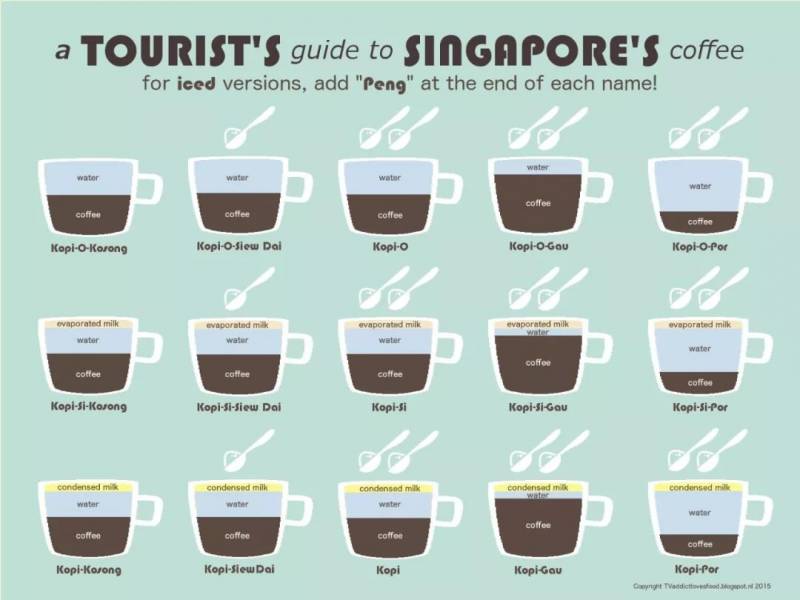 咖啡在新加坡和马来西亚叫做Kopi(马来语,读音有点像“国B”,粤语发音的话会比较像“葛B”),到咖啡店(Kopi Tiam)里的叫法如下(还有印尼也叫Kopi,不过叫法有点不一样,因为印尼就纯用印尼话了,而印尼话和马来语是一个语系,只是一些用词和表达方式语调稍微有些不同,相互都能听懂):