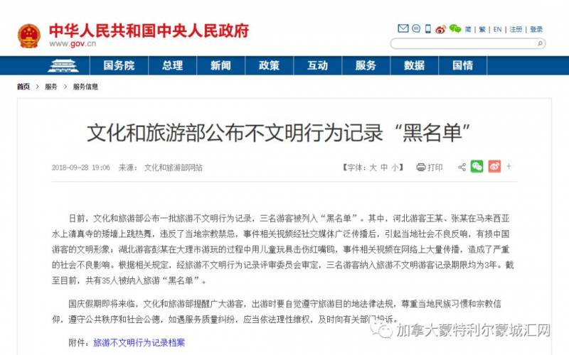 2018年9月底,文化和旅游部最新公布了一批旅游不文明行为记录,三名游客“光荣上榜”。