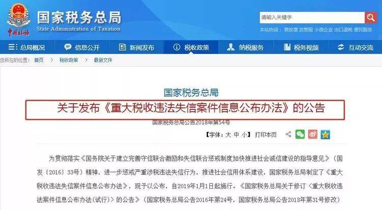 近日,中国国家税务总局最新公布了《重大税收违法失信案件信息公布办法》。