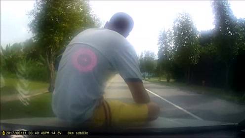 碰瓷男跳上车前盖又锤又闹要赔偿 一见警察马上怂