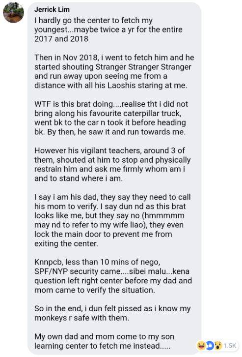 我很少去幼儿园去接孩子,一整年就去过2次 2018年11月的时候,我去接我儿子。他看见我边跑边喊,有陌生人,有陌生人,然后在离我有一段距离的地方停下来了,和他的几个老师一起盯着我看 这个小兔崽子在干什么......我这才想到我没有带他最喜欢的推土机玩具。于是我回到我车上去取玩具再回来。这次,他看到我就主动跑过来了 但是,他很有警惕性的3个老师,叫停了儿子并把儿子困拉住。很严肃的问我是谁 我说我是他爸爸,老师并不相信,让我打给妈妈来确认。我说不用吧,儿子长得很像我,你们看不出来吗? 老师们说,不像,看不出来。然后,他们把大门锁了起来,以防我进入室内。 10分钟后,警察来了。让我等我的父母过来,来确认情况。 尽管如此,我并没有感到愤怒,因为我知道我儿子在这家幼儿园会被保护的很好 最后,我可怜的被警察困在幼儿园,等我的爸妈过来接我回家。。。