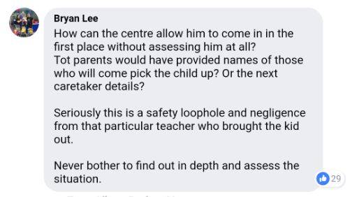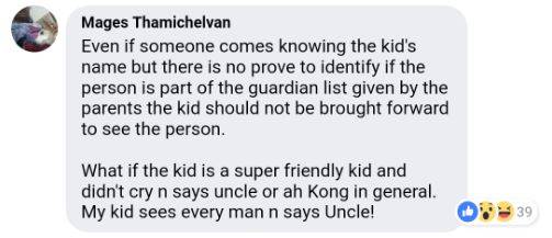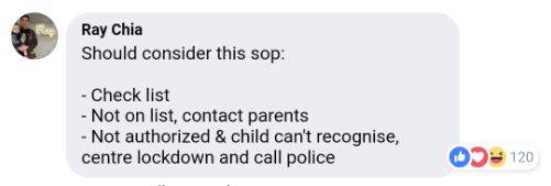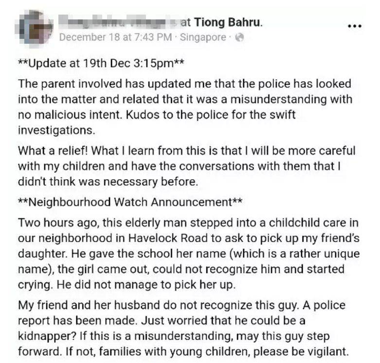 两个小时前,有位老人进入了在合乐路的幼儿园想要接走她朋友的小孩。 他给出了小孩的名字(其实小孩的名字挺特别的),女孩出来后,并不认识他,并开始哭泣,老人因此没有能接走女孩。 我的朋友和她的丈夫并不认识这位老人,因此他们报警了。我们猜想他有可能是一位拐带人口的人? 如果有任何误解的话,请这位老人站出来解释;不然的话,有小孩的家庭,要提高警惕了! 在发生了这件事情之后,我真心觉得,万幸没发生什么事情!以后我要多教一些小孩预防以及保护自己的措施,而之前我认为这些事情在新加坡是不需要做的,看来我错了!