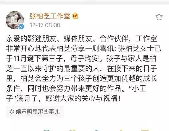 就在17号,张柏芝工作室的一条微博刷爆热搜,公开承认:张柏芝已与11月诞下第三子,母子均平安,现在孩子已经满月,张柏芝正在休养中。