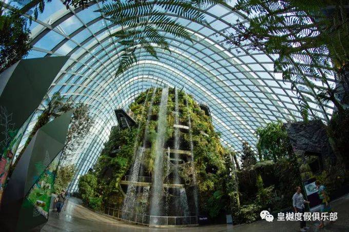 世界最大的玻璃温室花穹 (Flower Dome):b>模拟了地中海气候,来自5大洲的3万余株花卉植物在这里肆意生长,花卉布置会与不同的节日主题相呼应,不论什么时候也不论第几次到这里,都能收获别样的惊喜。世界最高的室内瀑布在另一个温室云雾林 (Cloud Forest):b>倾泻而下,较之干爽的花穹,模拟热带山地气候的云雾林更为湿冷。