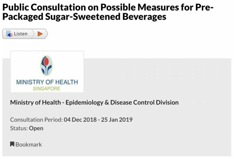 新加坡卫生部从上周开始对于包括征收糖税在内的四大“控糖”举措发起了问卷调查。在1月25日之前,大家都有机会在 www.reach.gov.sg/sugarydrinks 上提出自己的意见。